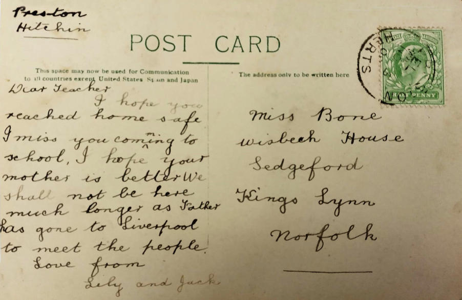 The postcard is from Preston. It is from ‘Lily and Jack’ to their Preston School teacher. She is at