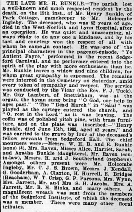 20 June 1908 at Sedgeford, Norfolk. Among the mourners was Mr B H Binks, whose family were