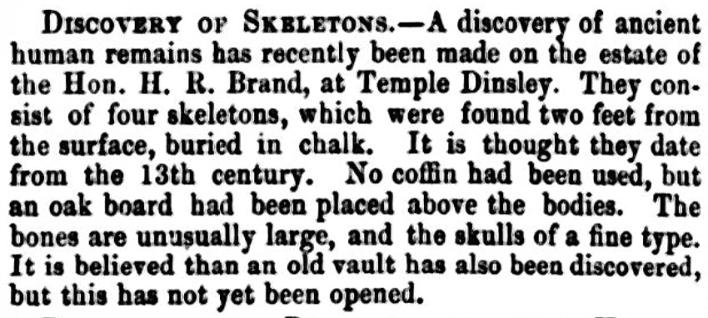Reginald Hine, when writing his History of Temple Dinsley, commented, ‘Skeletons of some of the